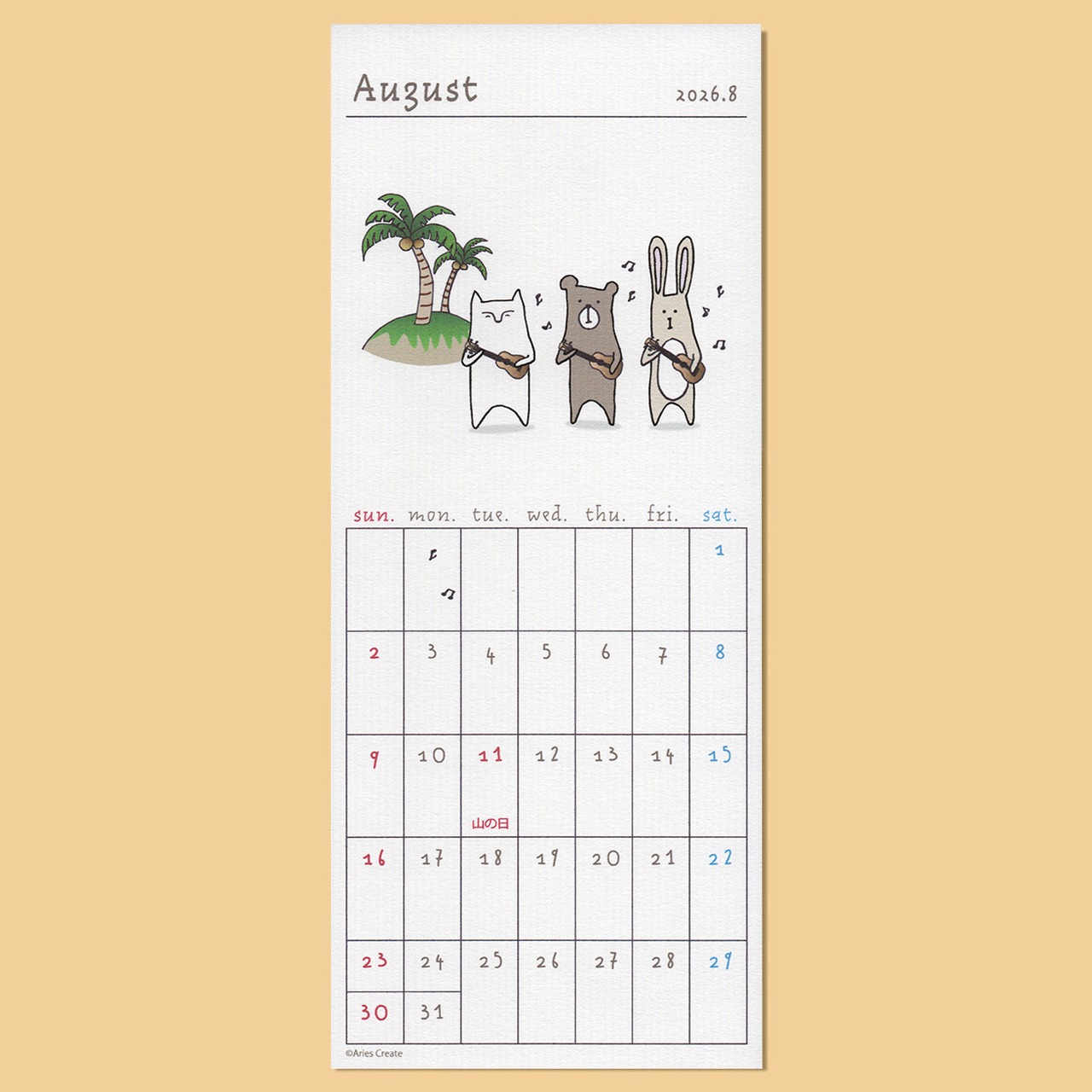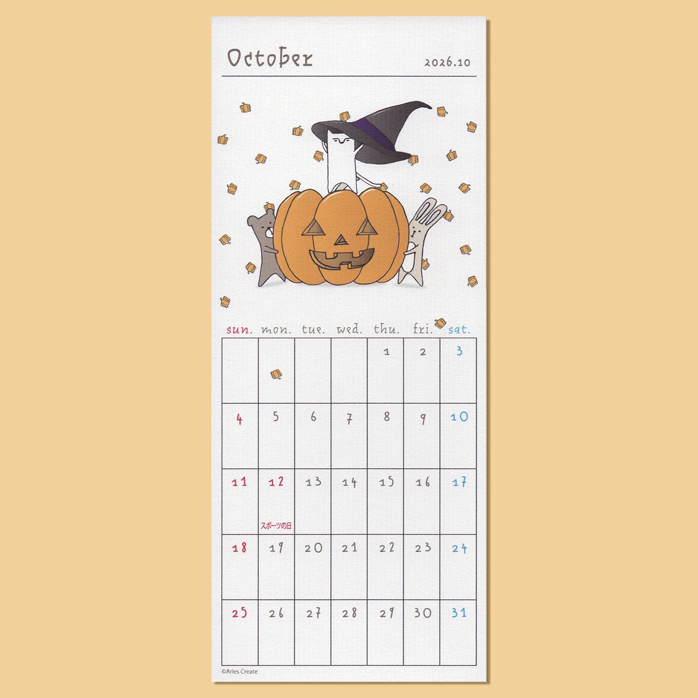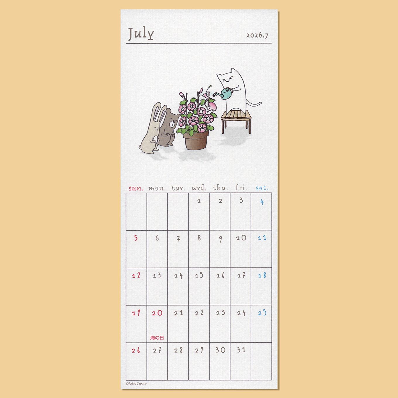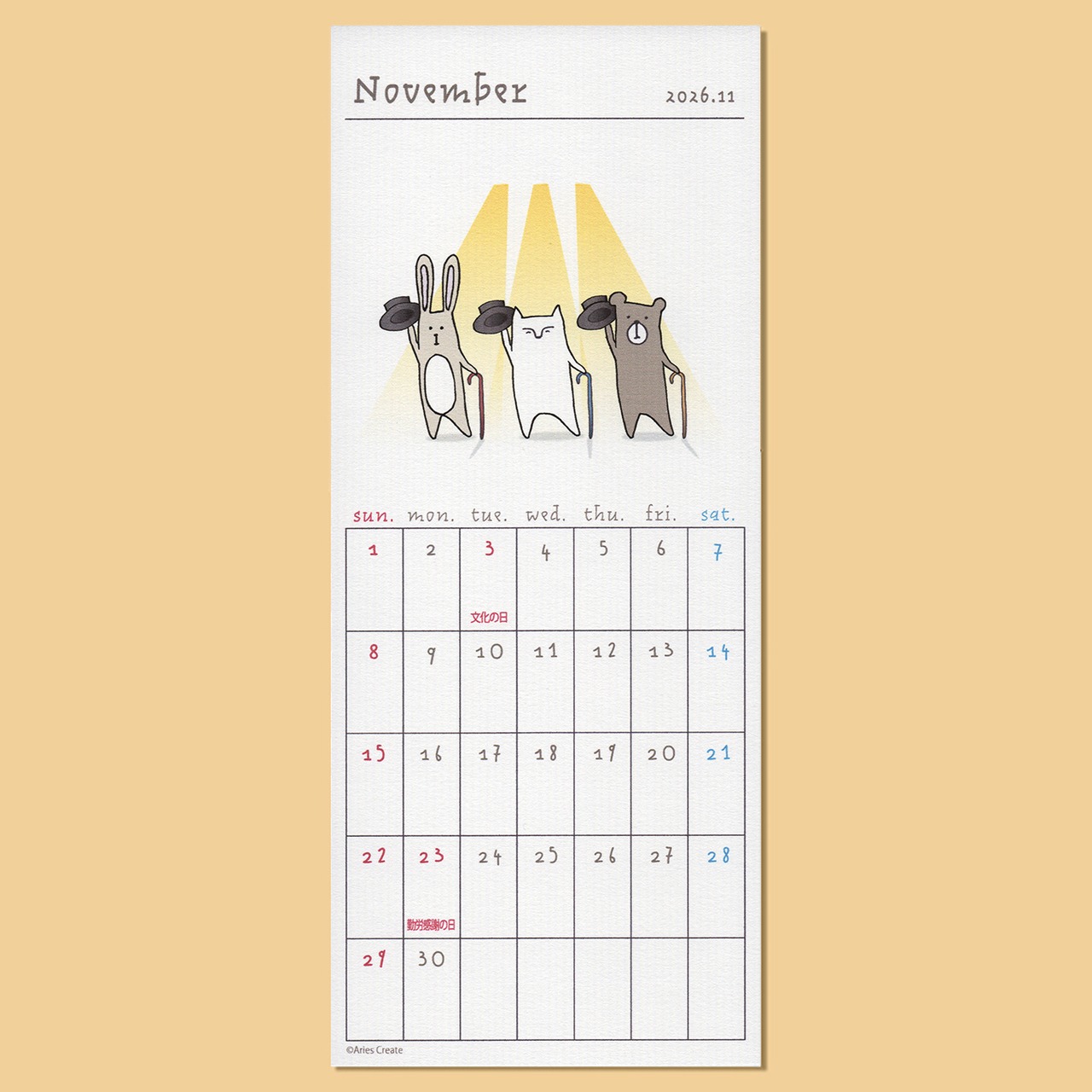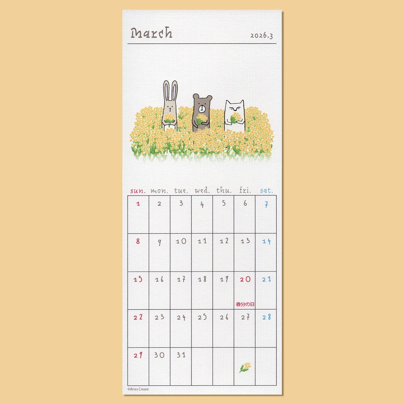 しろねこ、うさぎ、くまが仲良く季節ごとに遊ぶ姿を描いた、可愛らしい縦長カレンダーです。このカレンダーは、日常の中にちょっぴり癒やしを加え、お部屋やデスク周りにほっこりとした雰囲気をもたらしますよ!細長いサイズなので、柱にもスッキリと収まり、おしゃれなインテリアとしても活躍します。